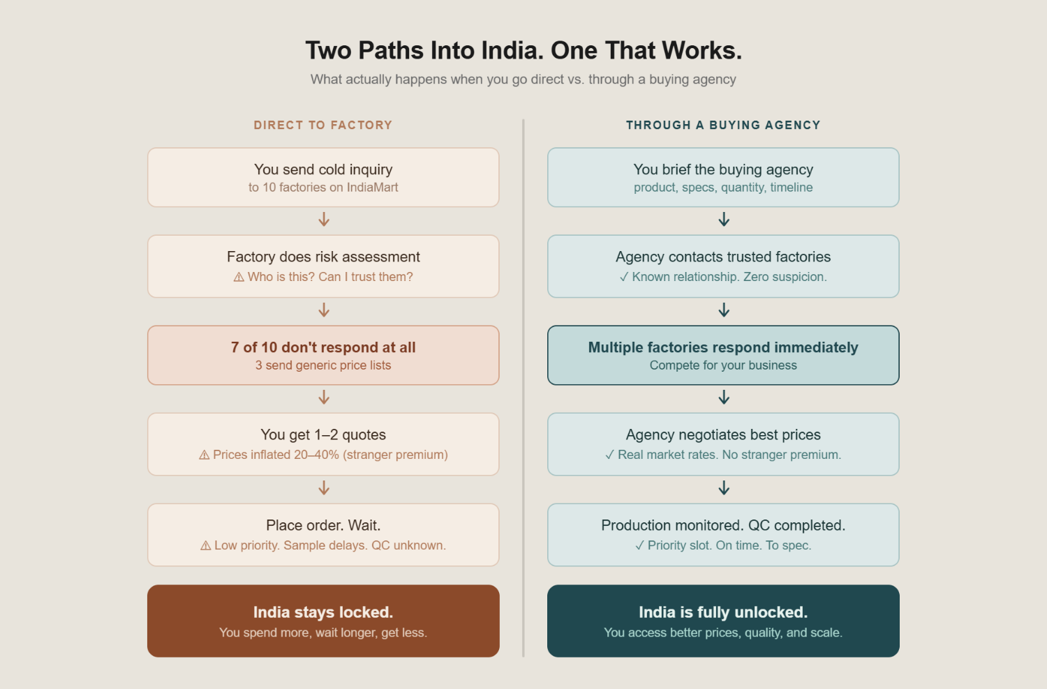 When a factory doesn’t know a buyer, it doesn’t know their market awareness. So they quote defensively – higher than their best price, with large buffers for “unknown buyer risk.” This means that even when you do get a response, the price you receive is not India’s real price. It’s a price with a stranger-premium embedded. It might be 20–40% above what a buying agency with an established relationship would negotiate for the exact same product.