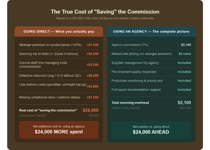 The commission isn’t a cost. It’s a return on investment with a measurable multiple. The buyer who “saves” $2,000 by avoiding an agency typically loses $24,000 in inflated prices, hidden inefficiencies, delayed delivery costs, and defective shipments. And that’s before counting the opportunity cost of the India sourcing programme that never actually got off the ground.